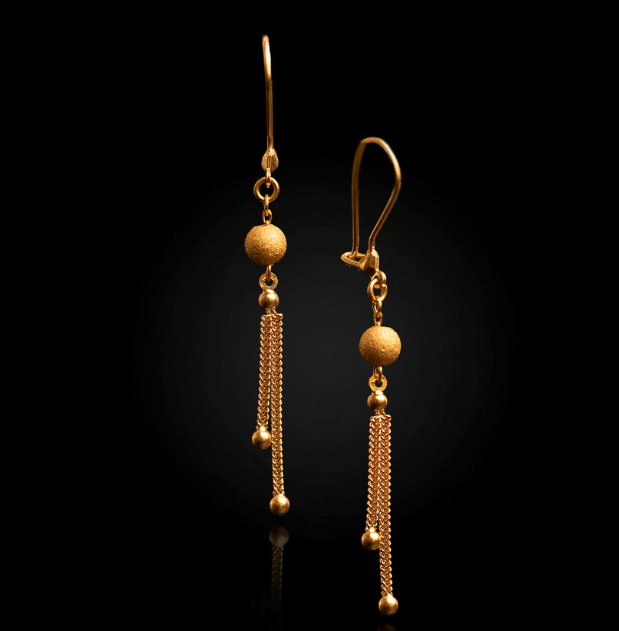 A truly beautiful pair of modern earrings crafted in 21k yellow gold featuring a matt textured finished spheres with tassels of foxtail chains with polished spheres suspended on closed shepherd hooks. Stamped with the 21k hallmarks. Metal: 21k yellow gold - XRF tested Weight: 2.98 grams Measurements: Length 5.8cm Era: Modern Circa 2020s |