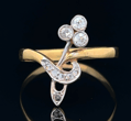 True to its era this beautiful Art Nouveau ring is crafted in two tone gold and features a central diamond set floral design on sweeping off-set shank. Diamonds: Three natural old cut, average material, estimated total weight 0.15ct Six natural small rose cut, average material, estimated total weight 0.04ct Total estimated diamond weight 0.19ct Metal: 12k yellow and white gold - XRF tested Weight: 1.44 grams Finger size: T1/2 Measurements: Base of ring width 2.4mm Era: Art Nouveau Circa 1900s |