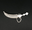 A truly beautiful ornate brooch from the mid twentieth century. Crafted in sterling silver this World War 2 period Ghurka Kukri sweetheart brooch features two parts connected by a fine chain. Showcasing a Kukri knife with a removable sheath decorated with fine cannetille wire work and granulation. Secured with a pin and hook catch. Metal: Sterling Silver Weight: 5.21 grams Measurements: Length 5.5cm Era: Mid 20th Century Circa 1940 A Gurkha Kukri sweetheart brooch is a sentimental piece of jewellery that features a miniature replica of the Gurkha's iconic kukri knife. These brooches were traditionally worn by family members, wives, and girlfriends of Gurkha soldiers to show support for their loved ones during their service in the British and Indian armies, especially during the World Wars. They are collected today as military memorabilia and represent a piece of history and tradition. |