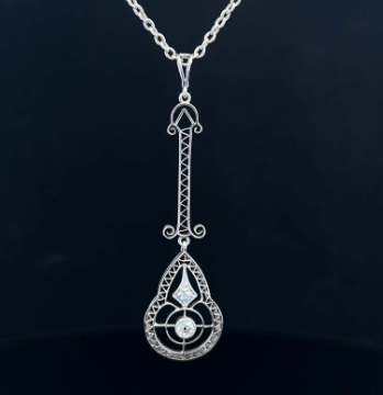 This was a wonderfully extravagant time during the reign of Edward the 7th. Brooches, necklaces, collars, pendants & earrings were lavishly decorated with gemstones. Diamonds were the essential accessory for the Edwardian lady and were made up into fine delicate pieces to reflect the fashions of lace, silk and feathers.