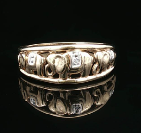 A late 20th century dress ring crafted in two-tone gold featuring three elephants trunk to tail within band of gold on a polished band. Stamped with the 375 hallmark and makers mark AS. Diamond: One natural round brilliant cut, 0.005ct Metal: 9k Yellow and white gold - XRF tested Weight: 2.08 grams Measurements: Base of ring width 1.77mm Finger size: R Era: Late 20th Century Circa 1990s |