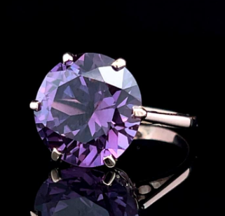 This statement ring from the late 20th century is crafted in 9k rose gold and features a synthetic alexandrite gemstone within a claw basket setting upon a fine polished band. Stamped with a worn maker's mark and the 14k hallmark, however, the XRF gold test was 9k gold. Gemstone: One round cut synthetic corundum imitating Alexandrite, 13.3mm, with a red/purple colour change Metal: 9k rose gold - XRF tested Weight: 4.17 grams Measurements: Base of ring width 2.14mm Finger size: L1/2 Era: Late 20th Century Circa 1970s |