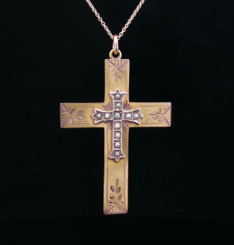 This beautiful cross pendant holds a piece of early Australian jewellery history, crafted by Aronson & Co. jewellers. Crafted in 9k yellow gold this hollow cross displays a satin bloomed finish with detailed hand-engraving and features a second raised pearl set budded cross is placed in the centre. Suspended by a round jump-ring bail. Stamped with the 9k hallmarks and makers mark Aronson + Co of Melbourne, Victoria, Australia. Gemstone: Ten natural half pearls Metal: 9k yellow gold Weight: 3.15 grams Measurements: Length 4.7cms, Width 3cms Era: Victorian Circa 1890s Chain sold separately |