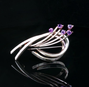 A beautiful German made retro style brooch crafted in 14ct yellow gold. Featuring ribbons of curled gold with a spray of gold set with light purple amethyst gemstones. Secured with a pin and roller catch. Stamped with the 585 hallmark with makers mark KJ with an arrow for jewellers Kollmar & Jourdan of Pforzheim, Germany. Gemstone: Five natural round cut amethysts, light purple colour, good material. Metal: 14k yellow gold - XRF tested Weight: 7.04 grams Measurements: Length 5.5cm, width 2.6cm Era: Retro Circa 1960 |