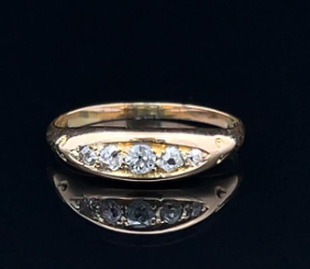 This beautiful Edwardian gypsy style ring is crafted in 18k yellow gold and features bead-set graduated mix of old cut diamonds on a tapered band with subtle engraving. Diamonds: Five natural mixed old cuts, average material, estimated total weight 0.14ct Metal: 18k yellow gold - XRF tested Weight: 2.03 grams Measurements: Base of ring width 1.5mm, top setting width 4.90mm Finger size: K Era: Edwardian Circa 1910s |