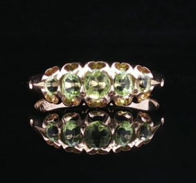 This beautiful half hoop ring from the late Victorian era is crafted in yellow gold. Featuring fine claw-set graduated oval cut peridots upon a scalloped undercarriage with a hand-carved shoulders on a polished band. Stamped with the worn 18ct hallmark and engraved with a personal message KC 1.1.1901 Gemstones: Five natural oval cut peridots Metal: 18k yellow gold - XRF tested Weight: 3.21 grams Measurements: Base of ring width 2.30mm Finger size: P Era: Victorian Circa 1901 |