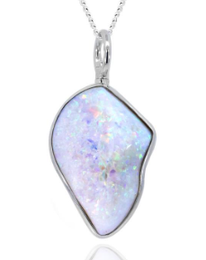 Opalescence freeform carved Coober Pedy opal pendant Solid crystal, fine quality featuring all spectral colours. Size: length: 27mm. Width: 12mm. Metal: 925 Sterling silver. Chain: 50cm 925 Sterling silver chain. |