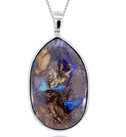 Opalescence Queensland Boulder Opal pendant with internal kernels of opal. Showcasing deep violet, blue, and green spectral colours. Pendant Size: Length: 50mm, Width: 25mm. Metal: 925 Sterling silver. Chain: 50cm, 925 Sterling silver chain. |