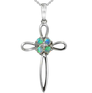 Opalescence cross pendant with round cabochon cut opals 0.20ct total weight. Coober Pedy, class 1, transparent opal, with mauve, green and red spectral exchange. Diamond: 0.01ct weight, colour G-H, clarity: SI. Metal: 14ct white gold and 18ct adjustable chain. Measurements: 35mm long x 19mm wide this measurement includes the bail. |