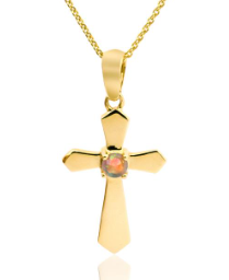 Opalescence cross pendant with a cabochon cut, round shape, Coober Pedy opal set in yellow gold. Opal: 0.07ct, Coober Pedy, class 1, light opal, with green, mauve and red spectral exchange. Metal: 18ct yellow gold. Pendant length: Approx 25mm long. Chain: 18ct yellow gold, adjustable 42-45cm |