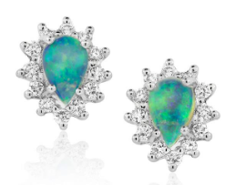 Opalescence cluster stud earrings with cabochon cut, solid opals and diamonds. Opal 2=0.47ct total weight, Coober Pedy, class 1, transparent opal, with mauve, green and red spectral exchange. Diamonds: 24=0.25ct total weight. Metal: 18ct white gold. Size: Approximately 9mm long. |