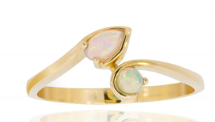 Opalescence Ring with cabochon cut oval shape Coober Pedy opals. Opal: 3=0.68ct, Coober Pedy, class 1, transparent opal, with green, mauve and red spectral exchange. Metal: 14ct yellow gold. |