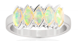 Opalescence Ring with five cabochon cut, marquise shape, Coober Pedy opals set in a row. Opal: 5=0.77ct, Coober Pedy, class 1, light opal, with green, mauve and red spectral exchange. Metal: 18ct white gold. |