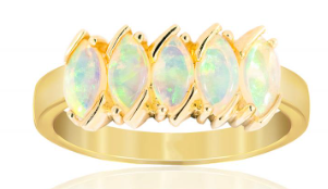 Opalescence Ring with five cabochon cut, marquise shape, Coober Pedy opals set in a row. Opal: 5=0.75ct, Coober Pedy, class 1, light opal, with green, mauve and red spectral exchange. Metal: 18ct yellow gold. |