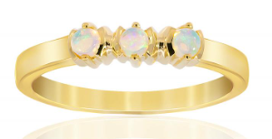 Opalescence Ring with three cabochon cut, round shape, Coober Pedy opals set in a row. Opal: 3=0.23ct, Coober Pedy, class 1, light opal, with green, mauve and red spectral exchange. Metal: 18ct yellow gold. |