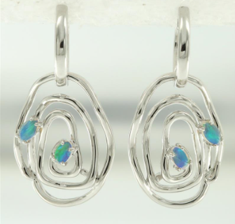 Opalescence earrings with a cabochon cut solid pear and marquise shape opals. Opal 4=1.28ct total weight, Coober Pedy, class 1, light opal, with mauve and green spectral exchange. Metal: 14ct white gold. Size: Approximately 25mm long and 6mm wide. |